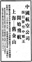 1947年中航上海-舊金山航線廣告,航班每月出發二次,需時40小時,票價九百美金,後減為七百。整理者提供